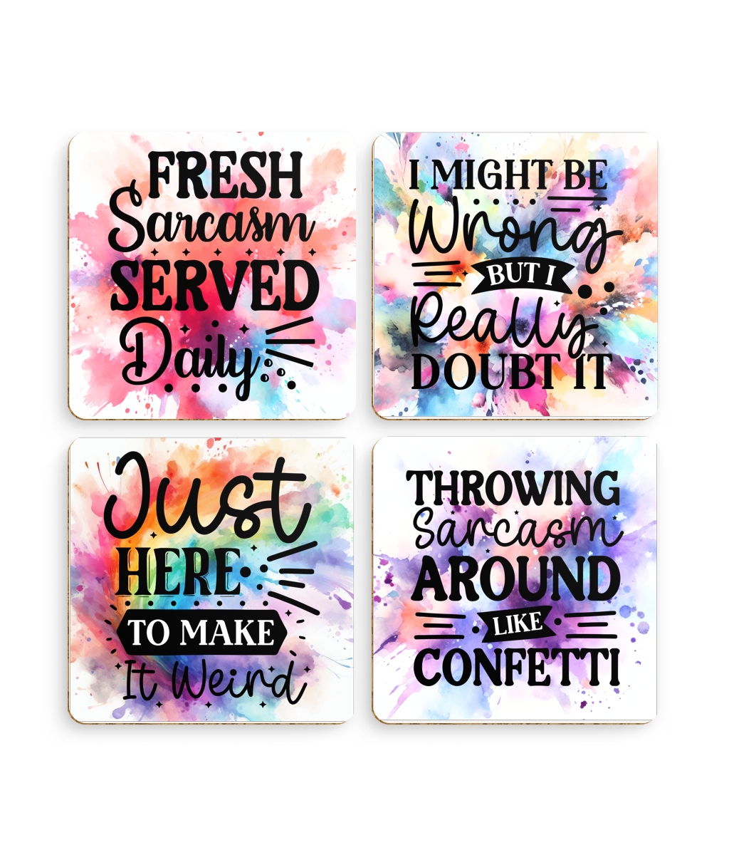 Sarcastic Quotes on 4 Individual Coasters - Funny Design - Bright Watercolour Splashes